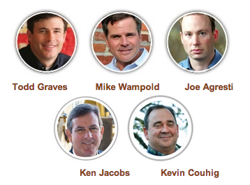 The sharks and investors are also a group of five, all successful entrepreneurs in the area. They include: Todd Graves, Mike Wampold, Ken Jacobs, Joe Agresti, and Kevin Couhig.